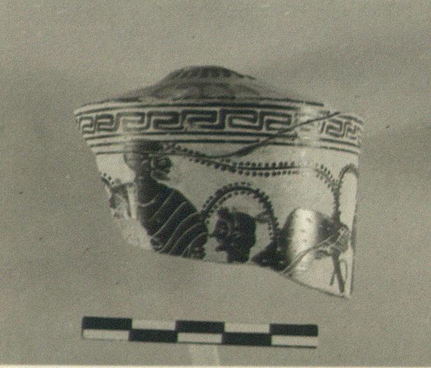 | Description: | Part of top of figured scene. Two draped bearded figures look at each other, winged boy (sphinx?) between, wearing fillets. Polished white ground. Red on beards, fillets, folds, band on wings. | |