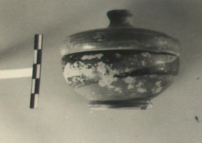 | Description: | Surface of bowl quite chipped. Bowl with ring foot and flange to receive lid. Lid with flat-topped peg handle in center. Glaze fired irregularly, mostly red except inside bowl. Inside of lid reserved, rubbed with miltos. Underside of foot, glaze wash. | |