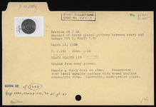 Description:   Mended from many pieces. Handle a thick disk on stem. Ornamented over level outside surface with broad moulded concentric ribs. Underside with much peeled glaze.
