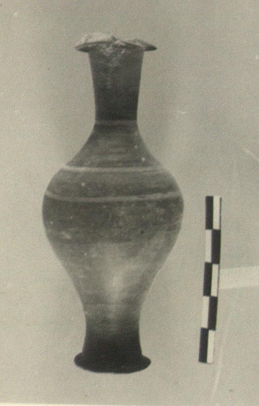| Description: | Fusiform shape. Good part of lip missing. Foot chipped. On neck, milky between red stripes (careless), also around shoulder, below three-line red spiral, also around body. Gray surface mottled with reddish brown; clay bright red in breaks. | |