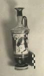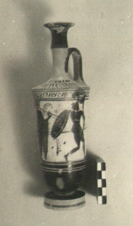 | Description: | Pieces of surface broken away. Chimney mouth. Draped figure playing the double flute between armed (helmeted) warriors moving right, looking left. Above, maeander. On shoulder, rays on red ground. Cf. P 10318. | |