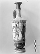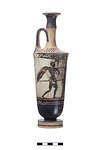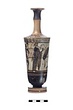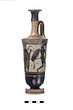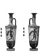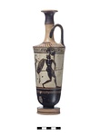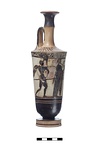 | Description: | Pieces of surface broken away. Chimney mouth. Draped figure playing the double flute between armed (helmeted) warriors moving right, looking left. Above, maeander. On shoulder, rays on red ground. Cf. P 10318. | |