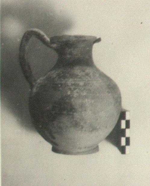 | Description: | Nick from lip. Round mouth, grooved handle, ring foot, roughly grooved underneath. Three bands of rouletting on shoulder. Reddish-buff micaceous clay unevenly fired. Thin red glaze unevenly applied over upper part. | |