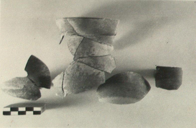 | Description: | About one-third preserved, mended from many pieces. No handle nor any part of the bottom. Body narrows to an offset slightly concave flaring rim. Red clay, grayish-buff on outer surface. Thin fabric. | |