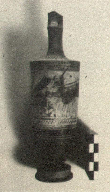Description:   Repaired. Rim, handle and bits of side missing. Surface damaged. Two quadrigas race(?). Charioteer to left is bearded. Vestiges of white on his dress. Dotted bands above and below. On shoulder, rays.