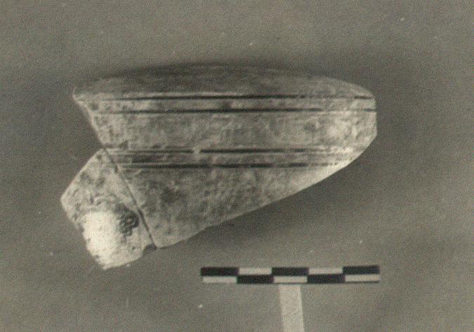 | Description: | Two joining fragments, giving part of the palmette pattern on the shoulder, the maeander just below, and the top of one figure, most of head with hand in hair. This latter in golden glaze, maeander and palmette matte, bands above and below maeander glaze, ground creamy. | |