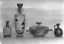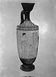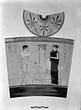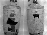 | Description: | Small fragments of shoulder, walls and foot missing; mouth and neck black; black below scene worn. In the neck, an inset, which alone could be filled from the mouth: H. 0.057 from neck down; Diam. 0.031; Th. of walls ca. 0.003. Flat bottom, left rough. At base of neck, egg pattern; three palmettes with tendrils on shoulder. Above scene, maeander broken by dotted X-squares. Reserved line below scene. A youth and a woman face each other at a stele; the youth, standing at the left, is nude, and holds a strigil in his left hand. On the wall behind him hangs an aryballos. The woman wears a purple chiton; in her left hand she holds an alabastron; with her right she clasps the top of her head. On the wall behind her, a cloth with strings (sakkos?). The plain stele rests on three steps, and is topped by a simple moulding, just below which are tied fillets, one red and one brown. Firm glaze drawing (not relief lines) shading to brown; light brown for her hair. Publ. ca. 440 B.C. | |