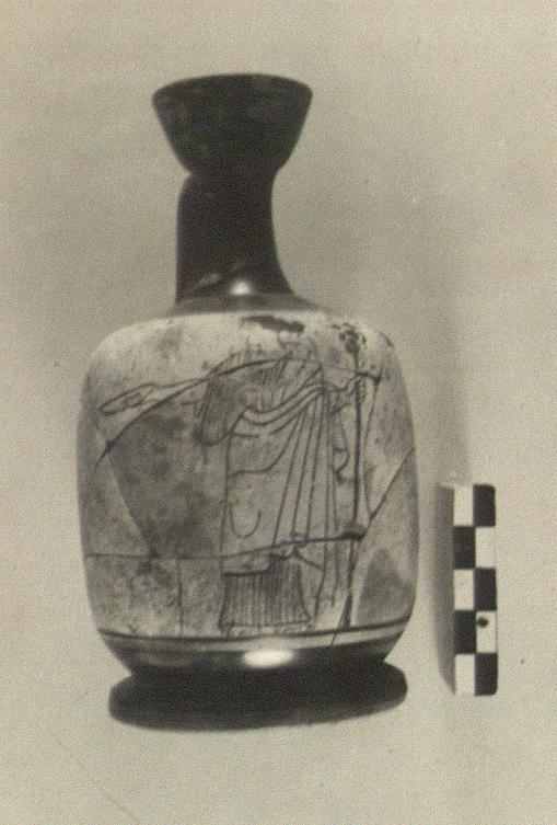 | Description: | Mended from many burned fragments. All preserved save small chips. Squat type. Maenad with thyrsos and patera. Folds of chiton in thin glaze. Rest of drawing in a thick black glaze line. Ground discolored by burning. Whole top of jug glazed including inside of mouth. Neck set in a little on shoulder. Shallow groove at start of white near outside of shoulder. Below picture, glazed with reserved stripe near top. Underside and all but top of outside of ring foot reserved. | |
