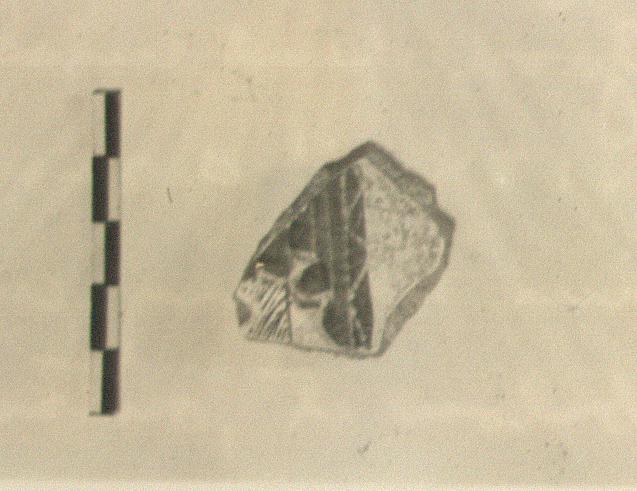 | Description: | Depicts piece of drapery hanging from a seated(?) figure. At left edge of fragment, what appears to be the end of a piece of wood square in section, hatched diagonally (part of a chair?). Above and behind this hangs the drapery. Ground a firm almost chalky white; wood(?) in distinct relief lines, drapery matte black with borders in thick white, dotted. Outside appears to have been banded with glaze, a good deal peeled. Blistered(?). | |