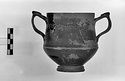 Description:   Intact. Grooved ring foot and groove where upper and lower walls meet. Ivy leaf thumb-rests on handles. In handle zone, ivy tendrils with incised stems. Terracotta paint leaves; berries in white.