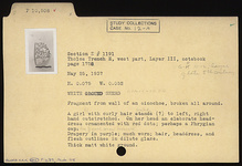 Description:   Fragment from wall, broken all around. Squat type. A girl(?) with curly hair seated(?) to left, right hand outstretched. On her head an elaborate headdress ornamented with red dots; a Phrygian cap; the figure wears trousers.