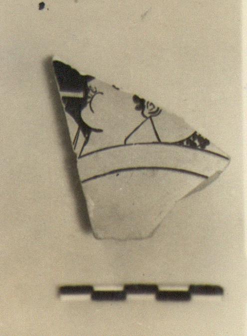 | Description: | Fragment from wall of a krater, broken all around. Part of the head of a trumpet player to left, wearing crested Attic helmet and round shield; his trumpet to his lips. Relief contours throughout; rim of shield marked by both a painted and an incised line inside and out; the latter having red miltos in its bottom. | |