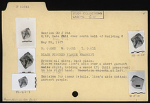Description:   Broken on all sides; back plain. Figure wearing lion's skin over a short garment walks right, holding a sword(?) in his right hand. Incision for inner details, lion's skin dotted; garment purple.