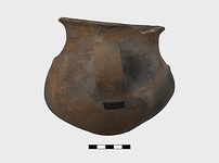 | Description: | Chip missing from lip. Squat pot with wide mouth and out-turned lip. Angular body sloping to a small depressed bottom. Two vertical band handles on shoulder; front and back, on the shoulder, two small raised knobs. Gray clay; black slip, burnished; considerably worn. Very irregularly made; one side much lighter than the other. Midde Helladic? | |