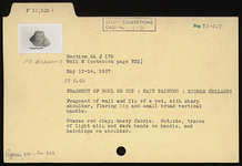 | Description: | Fragment of wall and lip of a pot, with sharp shoulder, flaring lip and small broad vertical handle. Coarse red clay; heavy fabric. Outside, traces of light slip and dark bands on handle and hatchings on shoulder. Middle Helladic. | |