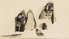 | Description: | Three fragments: a) From the lebes. Upper part of a female figure right. She wears thin chiton, embroidered head band and earring, and carries a large casket, ornamented with bosses and with a double row of egg and dot pattern, in her outstretched arms. An embroidered scarf falls over her right hand. Behind her, a bit of drapery; above, handle attachments, with tongues between. b) From the stand. Part of a woman, right, carrying a box; facing her, the hand of another figure holding a large plemochoe, a scarf over the hand. A small scarf in the field beween the two figures. Maeander above. c) From the stand. A cushioned stool, with an embroidered scarf falling in front of it; from the right, an extended right hand holding a mirror. Bit of drapery at extreme left. Some object in field above mirror. d) Fragment of flaring base, black; tongues above and part of a foot. e) From lower part, with tongues and foot left. f) From upper part, bit of drapery. A little relief contour on a), none on b) or c). Brown wash on the mirror; some brown shading on drapery. b) and c) put together with plaster. | |