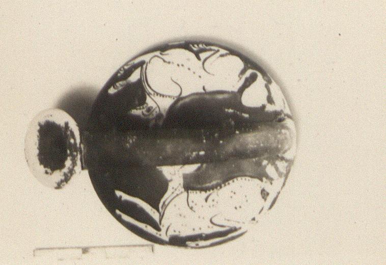 | Description: | Intact except for hole in bottom. Shallow type; spout set an an angle. Flat bottom. On the upper body, a dog and a rabbit (or deer?), both facing the spout. No relief contour. Glaze thin, somewhat worn; not reaching quite to bottom. | |