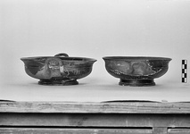 | Description: | Moulded ring foot and ribbed body; a small bit of the rim, nothing of the handles preserved. Stamping on floor; eggs, linked palmettes, eggs and tongues. Reserved line above foot outside, and narrow reserved bands on moulded underside. Good black glaze. | |