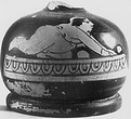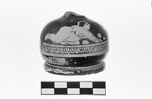 Description:   Small squat lekythos; neck, mouth and handle missing. Ring foot. On front of body, child, crawling right and playing with three balls(?). Child nude save for an amulet string which passes over the left shoulder and under the right arm.