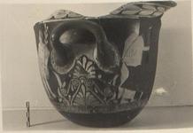 | Description: | Many joining fragments preserve about two-thirds of the circumference of the vase, and part of the rim. Filled out with plaster; nothing of the base preserved. A) Four standing figures: a bearded male; a woman in chiton and stephane, holding a long banded scepter; a youth with chlamys, travelling hat and short staff (top missing; possibly cadeuceus); a second youth, wreathed, with folded cloak over arms, and a long laurel branch in his left hand. (Possibly Zeus, Hera, Hermes and Apollo?) Rocky ground line indicated by light incisions over glaze; between the two youths, a plant. Relief contour for profiles and napes; some brown inner drawing; white, yellowed over, for the ribbon which ties Apollos' wreath, and for the berries on the laurel spray. B) Three cloaked figures (the central one missing except for his staff). No contours. Laurel wreath on rim; egg and dot around handles; double palmette ornament between handles and beneath; lower border, on A, dotted checkerboards; on B, dotted X-squares. | |