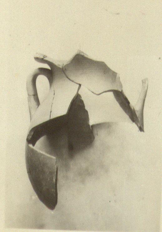 Description:   Fragmentary; the base, a large part of the walls, about two-thirds of the rim, and the upper part of one of the handles missing. Flaring lip.