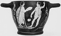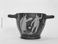 Description:   Fragments of wall, and both handles missing. Restored in plaster. Heavy type; with substantial ring foot; wall shows S-curve. Coarse palmette ornaments at handles. Double reserved ground line. On either side, a cloaked and a nude standing male figure.