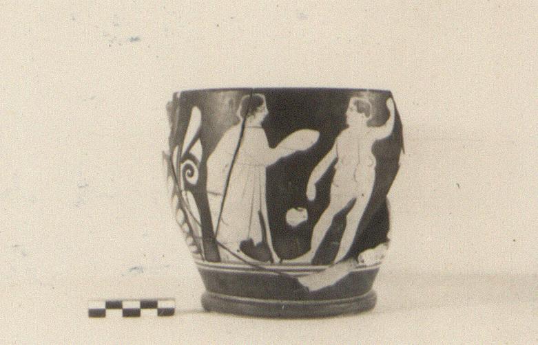 | Description: | Fragments of wall, and both handles missing. Restored in plaster. Heavy type; with substantial ring foot; wall shows S-curve. Coarse palmette ornaments at handles. Double reserved ground line. On either side, a cloaked and a nude standing male figure. A) The cloaked figure, right, holds out some object to the other, who is seen from the back, but with his head turned to left. His right arm is raised; in his left he carries an aryballos. B) Similar; the cloaked figures holds out a strigil. No contours. Glaze mottled. Extemely coarse work. | |