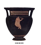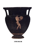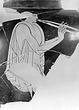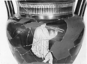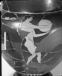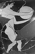 | Description: | Fragments missing from body; restored in plaster. Foot in two degrees. A) On neck, lotus bud band. A youth, wreathed, and with a short cloak hanging over his shoulders, moves right, playing the double flutes. B) Neck, plain. Nude youth right, a discus held in his outstretched hands. Relief contour on A, throughout except for front outline of lower right leg; on B, for profile and nape only, and for forward half of discus. A faded color (red?) for the wreath on A. Traces of added paint around outside edge of lip and handle, and probably inside edge of lip; possibly two, at least one, paint line all around under the figure zone; painted line over rays. | |