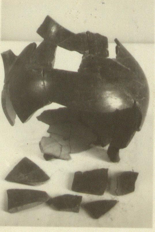 | Description: | Fragment of the upper part of the body, and the shoulder, only preserved, put together from many pieces. A few additional pieces, which do not join, are preserved. The broad body tapered slightly toward the bottom; at the top it merges with the sloping shoulder. The start, on the shoulder of a vertical handle with a single groove, is preserved. The heavy rather coarse gray fabric is burnished outside to a glossy black mottled with brown. For the fabric, cf. P 1088 (ΣΤ' 569). | |