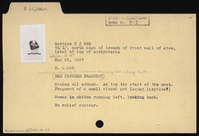 | Description: | Broken all around. At top the start of the neck. Fragment from a small closed pot (squat lekythos?). Woman in chiton running left, looking back. No relief contour. | |