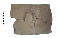 | Description: | Four joining fragments give the complete profile and preserve about one-quarter of the pot. Flat bottom; straight sides; one attached arching handle preserved on upper part of side. Clay coarse with white and purple particles, generally dark buff in color. Buff slip. Handmade. Mark of burning at one corner. | |