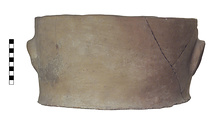| Description: | Mended from a number of pieces; fragment of rim and side and another small bit of body missing. Flat bottom, slightly projecting; straight sides; two attached arching handles. Coarse clay and pinkish slip. No trace of burning. Fabric as P 10583 (Φ 460). The pot appears to have cracked across the bottom (in making?) and over the crack was smeared dark brown clay. | |