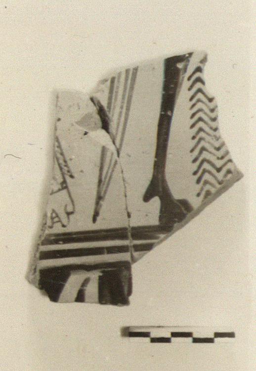 | Description: | Fragment from lower part of band of grazing horses, right. At left, head of one horse, then the tail and back leg of next at right, with horizontal zigzag filling ornament beyond the leg. Three horizontal bands below the figured zone, then the top of a zone of interlocking rays(?) as on P 10620 (ΘΘ 260). Head, mane and tail in outline; hoof outlined in added white. Pinkish clay, buff slip; brown to black glaze. | |