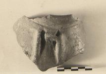 | Description: | Fragment from mouth and shoulder of a wide-mouthed pot, with a low vertical neck ending in a plain lip, and a round body. Fragment preserves one handle, a lug in shape of inverted U with two vertical piercings. Red slip on neck and outside, not on inside. ADDENDA Two joining fragmens added Oct. 1938 from Well U, preserving lower ends of handle, shoulder and part of lower body, showing that shape is characteristic biconical jar and that the ware is striped burnished. | |