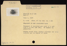 | Description: | Fragment of shoulder and neck of a pot similar to P 10640 (ΟΑ 185). No handle is preserved. Coarse brown clay; highly polished red slip outside and on inside of neck. Red Burnished Ware. ADDENDA P 10640: Wide-mouthed pot, with a low vertical neck ending in a plain lip, and a round body. Fragment preserves one handle, a lug in shape of inverted U with two vertical piercings. | |