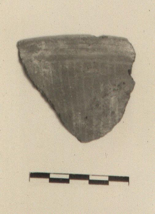 | Description: | Fragment of wall and lip of an open bowl with plain lip slightly out-turned. On outside of rim are traces of three horizontal bands, painted; wall was covered with narrow vertical stripes. Impossible at present to say what was original color of paint. Coarse brown clay, with gray core; highly polished red slip inside and out. Red Burnished Ware. | |