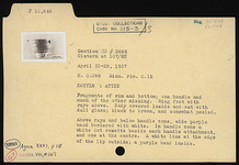 | Description: | Fragments of rim and bottom; one handle and much of the other missing. Ring foot with rays above. Body covered inside and out with dull glaze; black to brown, and somewhat peeled. Above rays and below handle zone, wide purple band bordered with white. In handle zone a white dot rosette beside each handle attachment, and one at the center. A white line at the edge of the lip outside; a purple band inside. Attic. | |