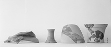 Description:   Two non-joining fragments; the high flaring stand foot, and another from high up, with part of the floor of the bowl. Above the rim of the foot, a raised rounded band. Bands, line maeander, diagonal hatching, and vertical wavy lines in metopes.