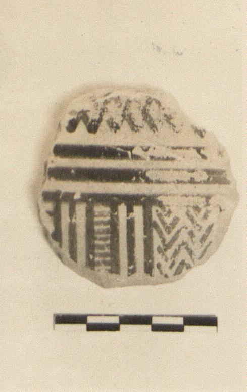 | Description: | Belongs with P 10664. Round disk cut from the wall of a heavy closed pot. Geometric decoration on the outside. | |