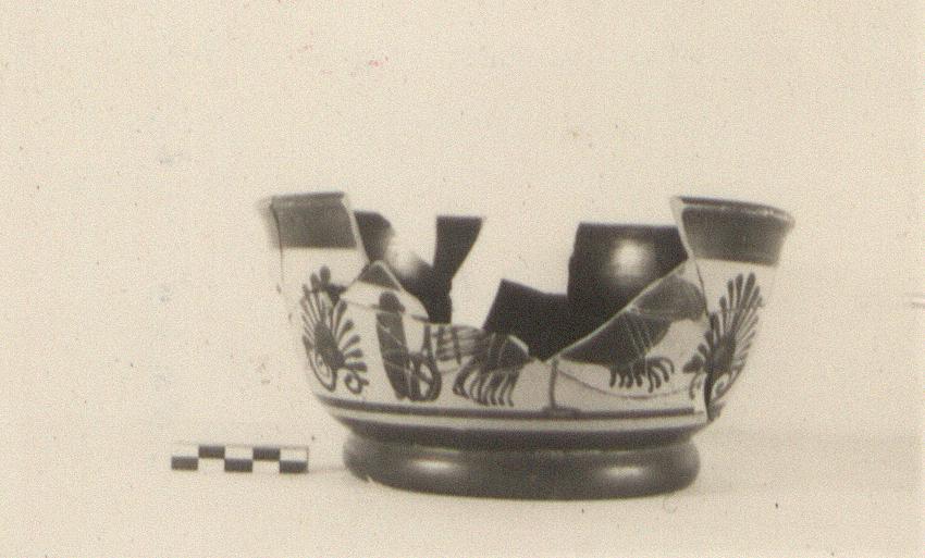 | Description: | Rim and walls fragmentary; handles missing. High ring foot and very wide open body with rounded rim. Beside the handles, palmettes dotted with white at the center; front and back, a four horse chariot, right. Incision scanty and careless. | |
