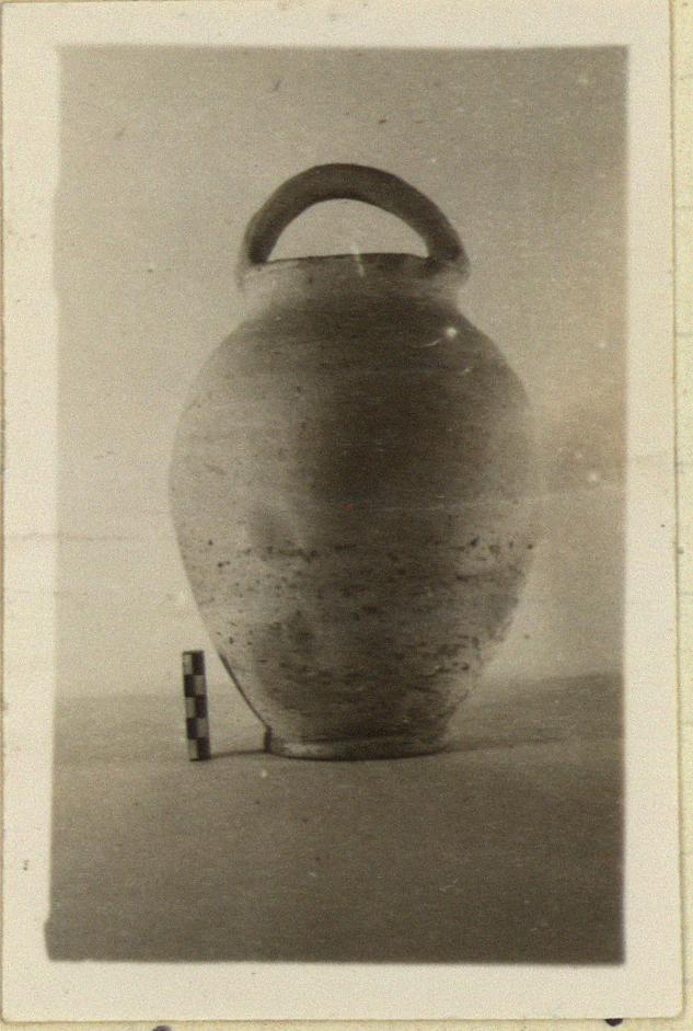 | Description: | Intact. Early neckless variety, with flaring mouth; ring foot. Handle grooved. Buff clay with grits; light slip. | |