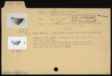 Pinkish-buff clay, extremely flaky; grayed on one side, as if from burning. Glaze red, almost entirely flaked off.