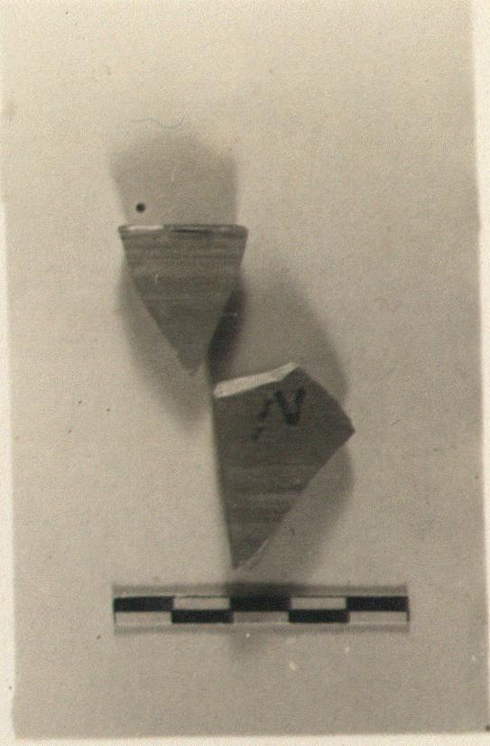 | Description: | a) Black glaze on inside and on top; three shallow grooves on outside. b) Fragment from lower wall; black glazed on inside, reserved on outside with at least three shallow grooves toward the bottom. In flaky black glaze on this lower wall: <graphic> | |