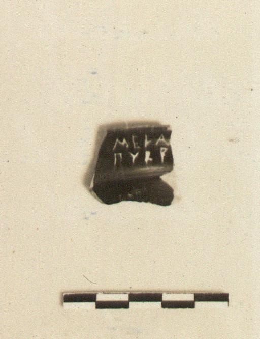 | Description: | Rim fragment of a black glazed cup with offset rim. Scratched through the dry glaze outside: <graphic> Inside: <graphic> | |