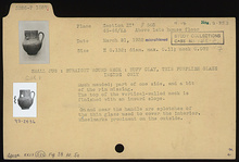 Description:   Much mended; part of one side, and a bit of the rim, missing. Straight round neck, finished with an inward slope. Wheelmarks prominent on the outside.