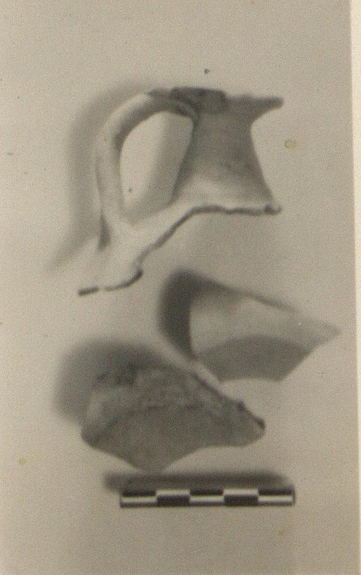 | Description: | Three non-joining fragments: neck and shoulder, and two bits of bottom and side. Round-bodied flat-bottomed jug with narrow tapering neck and flat projecting round lip; one vertical handle, shoulder to lip, set askew. Handle grooved down center. Pink clay with gray core; buff surface. | |