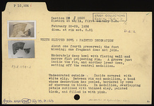 | Description: | About one-fourth preserved; the foot missing; one fragment does not join. Moderately deep bowl with flaring wall and narrow flat projecting rim. A groove just inside the rim, and another lower down, setting off the central medallion. Undecorated outside. Inside covered with white slip. Between rim and medallion, a band whose decoration has peeled, bordered by rows of chevrons in black. In medallion, overlapping petals outlined with thinned clay, painted black, and filled in with pink. | |