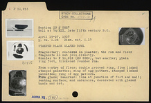 | Description: | Fragmentary; restored in plaster; the rim and floor fragments do not join directly. Similar to P 10912 (ΠΘ 2826), but smaller; plain ring foot, thickened rounded rim. From center of floor: double grooved ring, five linked stamped palmettes; ring of egg pattern, stamped linked palmettes; ring of egg pattern. Firm glaze; reserved: line at junction of foot and wall; resting surface; and underside, decorated with glazed bands and dot. | |