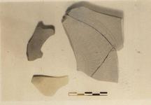 | Description: | Three fragments; none of the rim preserved. Moulded ring foot, and raised rings on bottom. Three bands of incised double tongue pattern between grooves on floor. Pinkish-buff clay, unglazed. | |