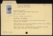 | Description: | Most of the horizontal rolled handle broken away; lip and foot chipped. High flaring ring foot and straight vertical rim, forming an angle with the lower wall. Dull black glaze, somewhat peeled; irregular over the lower part; underside of foot unglazed. | |